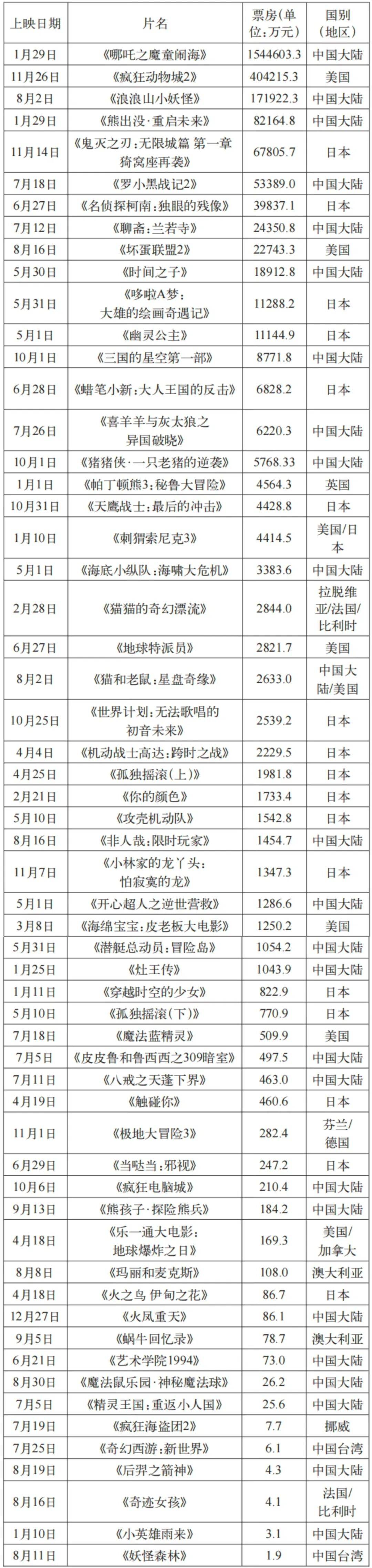 按照国度片子局发布的数据,2025年全年片子票房为518。32亿元。[1]2025年新上映动画片子58部,同比上升9个百分点;动画片子总票房252。8亿元,约占总票房的48。8%,同比上升33个百分点——这一数据不成谓不惊人,动画片子初次从市场平分走接近一半的票房,一是由于无论是国产动画仍是进口动画都呈现了超40亿元的大“爆款”:《哪吒之魔童闹海》飞跃式领跑春节档,成为桂林一枝的存正在;岁尾的《疯狂动物城2》上映后刷新高达55项影史记载。[2]二是全年各档期中都呈现了一些叫好又叫座的优良动画,如暑期档的《浪浪山小魔鬼》《罗小黑和记2》,第四时度上映的《鬼灭之刃:无限城篇第一章猗窝座再袭》(以下简称《鬼灭之刃》),这些影片配合支持起动画片子市场的全体盘面。正在中国片子史上,2025年必定会成为一个划时代的年份,动画片子初次承载起总票房的“半壁山河”。正在本年度上映的动画片子中,国产动画27部(含合拍片)、日本动画18部(含合拍片、沉映片)、美国动画8部(含合拍片)、欧洲动画5部、动画2部,形成了本年度院线片子的根基国别面孔。各片细致上映及票房环境见表1。